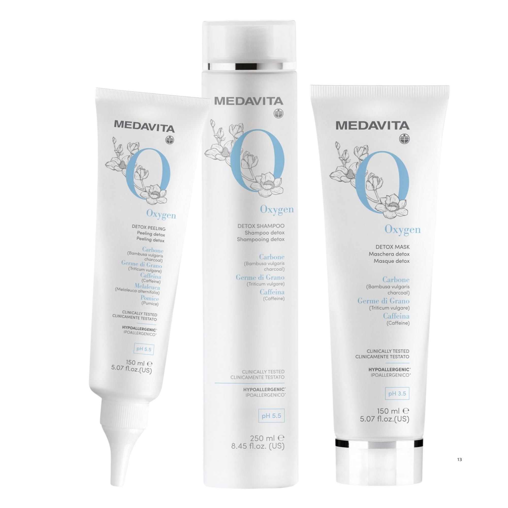 Medavita Oxygen okysličující a detoxikační šampon s pH 5,5 poskytuje maximální péči jak vlasové pokožce, tak vlasům samotným. Díky bambusovému uhlí, kofeinu a pšeničným klíčkům vlasovou pokožku okysličuje, zbavuje nečistot v podobě nahromaděného prachu, smogu nebo mazu. Zároveň obnovuje buňky a pomáhá tak vytvářet velmi přívětivé prostředí a půdu pro růst zdravých, pevných a silných vlasů. Mix složek zároveň poskytuje vlasovým délkám vitalitu, výživu a omlazující efekt.