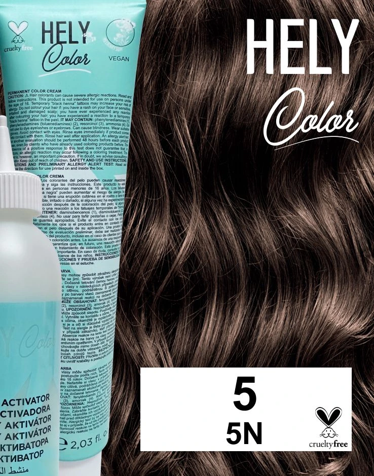Profesionální permanentní krémová barva na vlasy Hely Color je určena pro domácí použití. Vegan složení obohaceno o organický smil italský (Helichrysum italicum) a technologii plex zaručuje maximální krytí šedin, dlouhotrvající výsledek, lesklé a vyživené vlasy. Hely Color dokonale překryje šediny a obsahuje speciální pečující složky (smil italský), takže vlasy budou doslova zářit zdravím. Certifikát PETA Cruelty Free zaručuje, že produkt ani v něm použité suroviny nebyly testované na zvířatech. Speciální krémová textura napomáhá snadné a bezpečné aplikaci. Barva garantuje absolutní krytí šedivých vlasů, dlouhodobou stabilitu barvy, perfektní jednotné výsledky a neuvěřitelný lesk. Vyrobeno v Itálii.