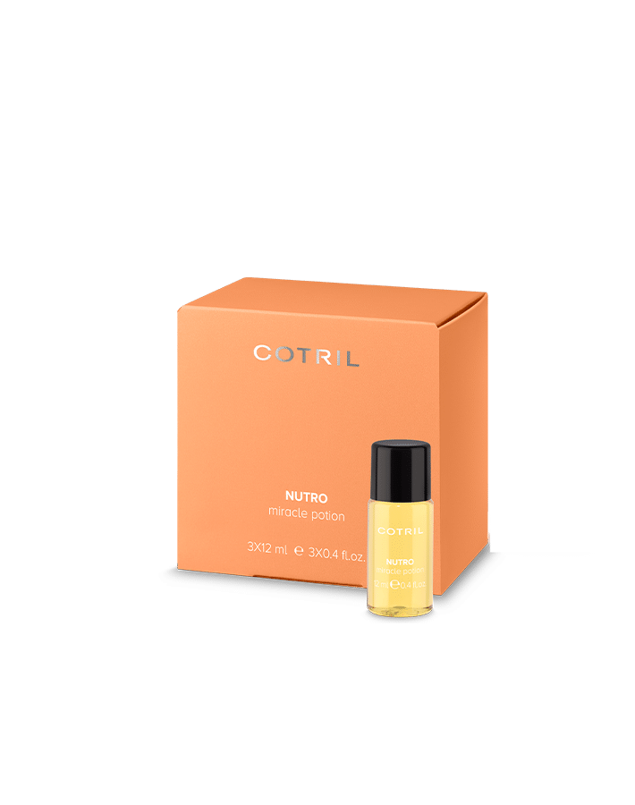 Ultra vyživujicí ampule Cotril Nutro (Miracle Potion) je silně koncentrovaný elixír pro okamžitou výživu matných, suchých a vyprahlých vlasů. Elixír dodává vlasům potřebnou výživu, zanechává je krásně jemné a hebké, a navíc krásně voní. Jedinečný mix 12 vzácných olejů z ořechů, semínek, bylinek a ovoce garantuje mimořádné vyživující působení. Tyto aktivní složky pomáhají vyživit jednotlivé vrstvy vlasového vlákna a zároveň obnovují přirozený hydrolipidický plášť pro lesklejší, zářivější a vitálnější vlasy bez krepatění. Elixír okamžitě vyživí suché vlasy, dodá jim dávku hydratace, a díky tomu se budou krásně lesknout a zářit zdravím. Již po první aplikaci jsou vlasy viditelně vyživené a se zdravějším vzhledem.
