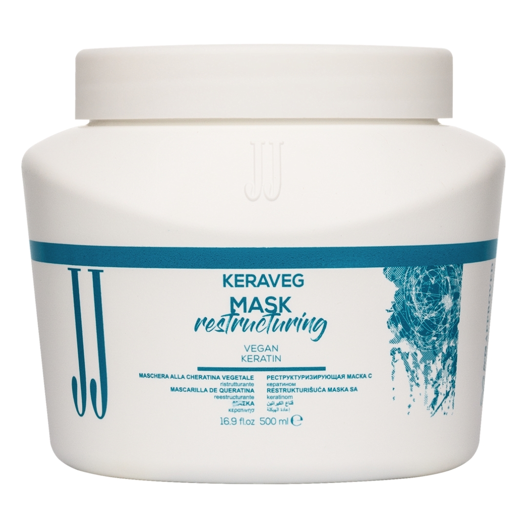 JJ Keraveg restrukturalizační maska (Restructuring Mask/Vegetal Keratin) obohacená o vyvážený komplex aminokyselin s různou molekulovou hmotností regeneruje a vyživuje poškozené a oslabené vlasy. Speciální rekonstrukční a revitalizační maska pro suché, křehké a zničené vlasy. Maska uzavírá kutikulu vlasu,podporuje restrukturalizační, hydratační a vyživující účinek. Maska je vyvinuta s unikátní směsi fytokeratinu, který v součinnosti s aminokyselinami, pomáhá rekonstruovat a chránit vlasy před poškozením. Vlasy budou neuvěřitelně měkké, hladké, dynamické a silnější. Maska posiluje jejich strukturu a snižuje lámavost. Neobsahuje sulfáty, silikony, parabeny, minerální oleje a umělá barviva.
