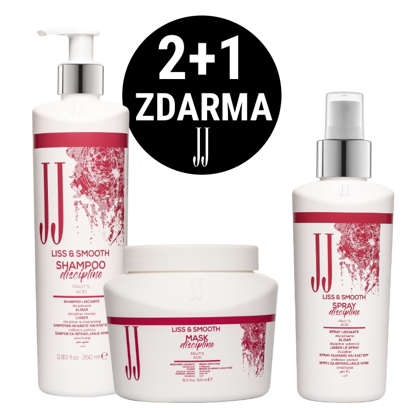 Akce 2+1 zdarma! Začněte péči o své vlasy s JJ Liss & Smooth a užijte si krásné, hladké a lesklé vlasy! K nákupu vyhlazující masky JJ Liss & Smooth 500 ml a vyhlazujícího spreje JJ Liss & Smooth 150 ml získáte zdarma šampon JJ Liss & Smooth 350 ml. JJ Liss & Smooth je určena pro neposlušné a nezkrotné vlasy, které toužíte uhladit a zkrotit. Tato řada obsahuje ovocné kyseliny, které mají schopnost uzavírat kutikuly vlasů a vyhlazovat jejich strukturu. Péče eliminuje nepříjemné krepatění a dodává vlasům lesk a hebkost.