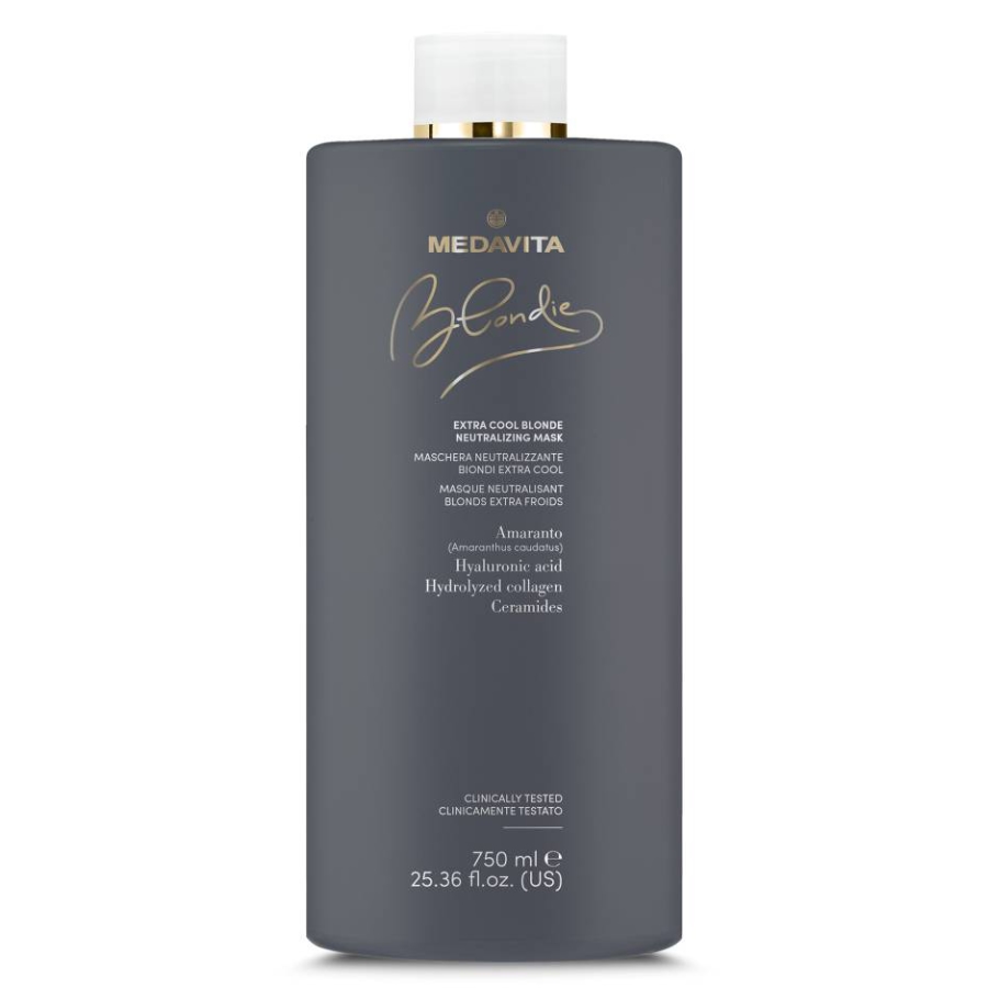 Vlasová maska Medavita Blondie Black (Extra Cool Blonde Netralizing Mask) je černá neutralizační maska pro dosažení extra studeného odstínu blond vlasů a pro odstranění teplých odlesků. Tónující maska obsahuje hydrolyzovaný kolagen, který vlasy zpevňuje a kondicionuje, kyselinu hyaluronovou, která vlasy hydratuje a zlepšuje jejich pružnost, proteiny z amarantu, které vlasy hydratují, chrání a vytváří na nich film, a cenný komplex ceramidů, který má obnovující a vyhlazující účinek na vlasy, zvyšuje jejich sílu a odolnost, a komplex aminokyselin Amino Concentré. Silver Blonde je novým trendem pro všechny, kteří milují stříbrnou blond. Silver Blonde je nová multi-odstínová barva, která kombinuje světlou blond s dotekem stříbra. Podobně jako platinová blond je chladnější, má tmavší stříbrný nádech a výsledkem je lesklá barva s metalickým efektem. Stříbrná blond je skvělou volbou pro každého, kdo touží po přirozeném, ale sofistikovaném vzhledu. Je ideální pro každého, kdo chce diskrétně zakrýt své přirozené blond, světle hnědé nebo šedivé vlasy. Použití černého šamponu společně s černou maskou zaručuje maximální kosmetický efekt barvení vlasů.