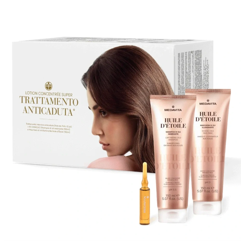 Šoková péče proti padání vlasů ve formě ampulí na bázi patentovaného složení z laboratoří MedaVita. Tajemství síly je ve vyšší dávce patentované směsi rostlinných extraktů. Extrémní účinnost je výsledkem unikátního a exkluzivního procesu přípravy. Bohatá na aktivní, pečlivě zvolené, látky rostlinného původu, na vazoaktivní látky a látky antioxidační a okysličující, které stimulují mikrocirkulaci a zpomalují enzymy zodpovědné za funkční změny způsobující vypadávání vlasů. Bohatý obsah funkčních látek rostlinného původu (aloe, zázvor, rákos, kafr, arnica, máta, galbanum, rozmarýn, skořice, myrha, muškátový oříšek) stimulují nový růst, posilují pouzdra kotvícího systému vlasů ve vlasovém folikulu a prodlužují životní fázi vlasu, vytváří ideální prostředí vlasové cibulce při růstu vlasů. Lotion Concentrée je speciálně určený v případech atonické pokožky (velmi suchá, zesláblá) s pomalou mikrocirkulací a zejména v případech, kdy padání již probíhá.