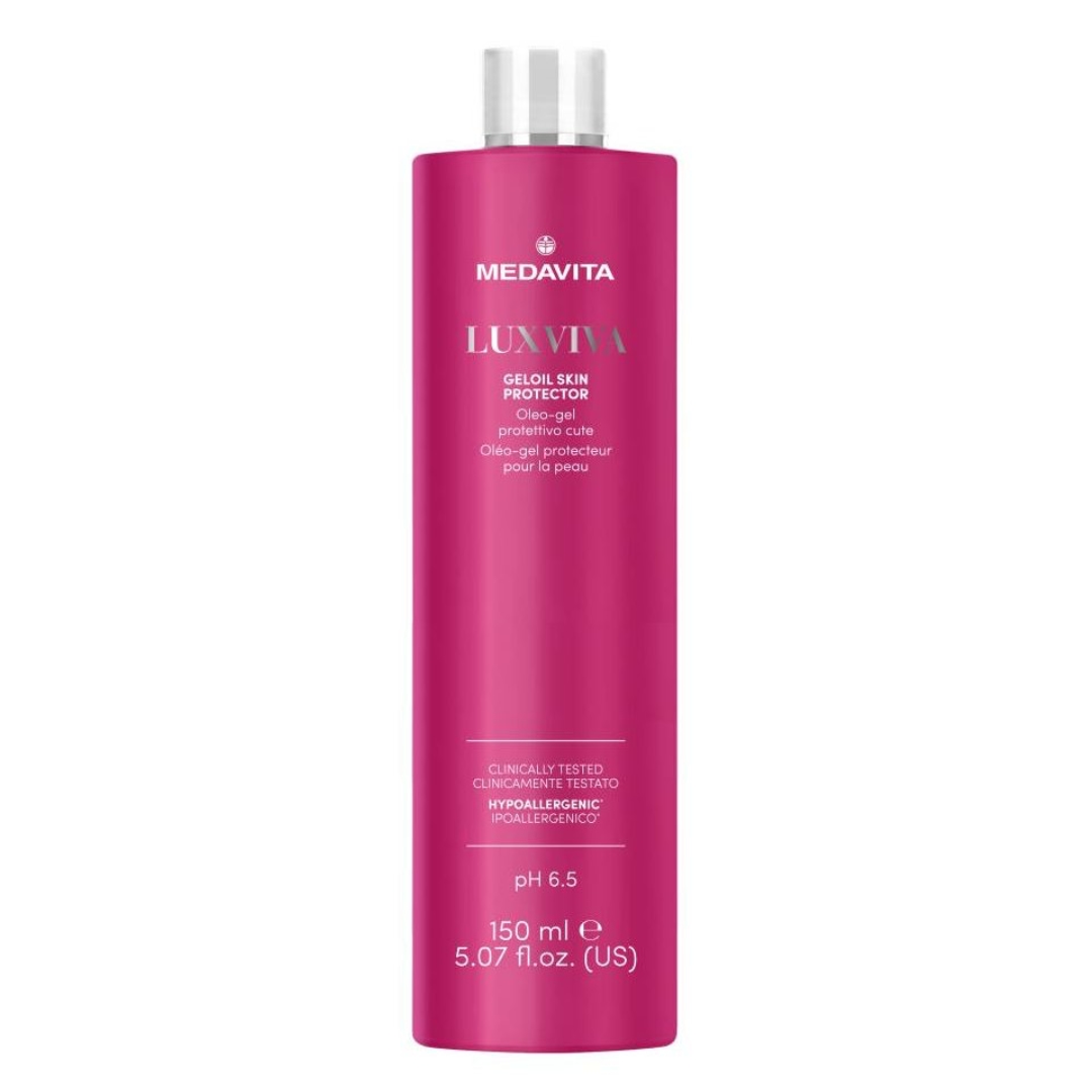Medavita Luxviva gelový olej (GelOil Skin Protector) s pH 6,5 pro ochranu kontur pokožky před zabarvením. Kolem vlasových linií vytváří ochrannou bariéru, která během aplikace barvy brání zabarvení kůže a vzniku nevzhledných skvrn. Účinný ochranný přípravek, který se snadno smývá vodou.