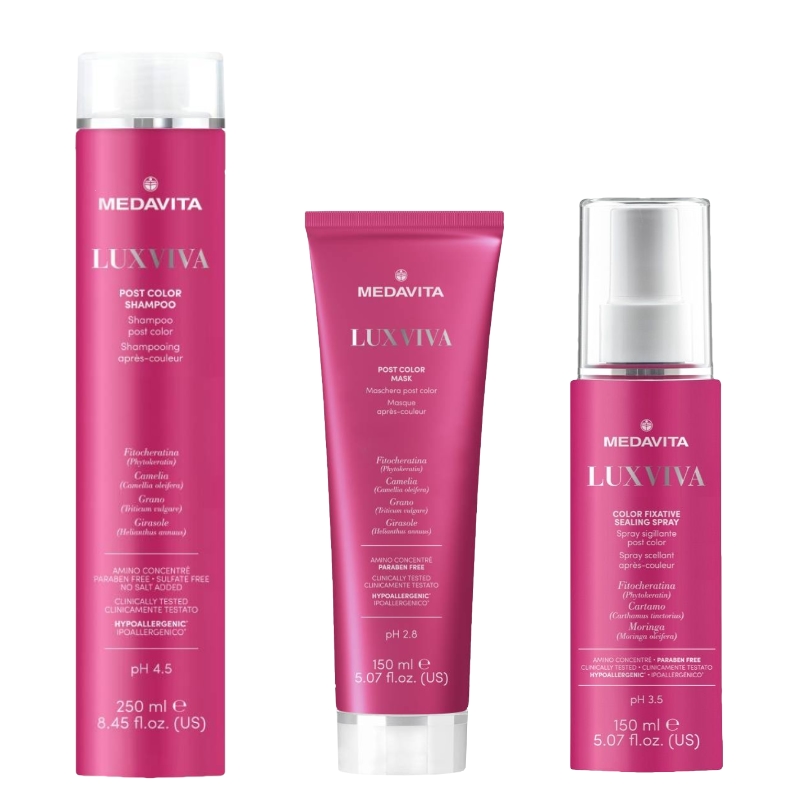 Medavita Luxviva fixační sprej pro fixaci barvy barvených vlasů (Color Fixative Sealing Spray) s pH 3,5 je rozjasňující a vysoce ochranný sprej pro barvené vlasy, který utěsňuje kutikulu a maximálně tak zamezuje ztrátě pigmentů z vlasů. Fixační sprej přináší barveným vlasům exkluzivní lesk, hedvábnost a zároveň usnadňuje sušení vlasů. Zaručuje maximální ochranu před okolní vlhkostí. Komplex účinných látek složený z fytokeratinu bohatého na aminokyseliny, ze světlicového a moringového oleje vlasy hydratuje, vyživuje, chrání, prodlužuje intenzitu a trvanlivost barvy, zjemňuje, působí proti volným radikálům, povzbuzuje, regeneruje a posiluje. Obsahuje solární filtry UVA a UVB a komplex Amino Concentré. Výsledkem jsou zářivé a hedvábné vlasy. Sprej je vhodný pro všechny typy vlasů. Jedná se o „leave in“ produkt, který se z vlasů neoplachuje.