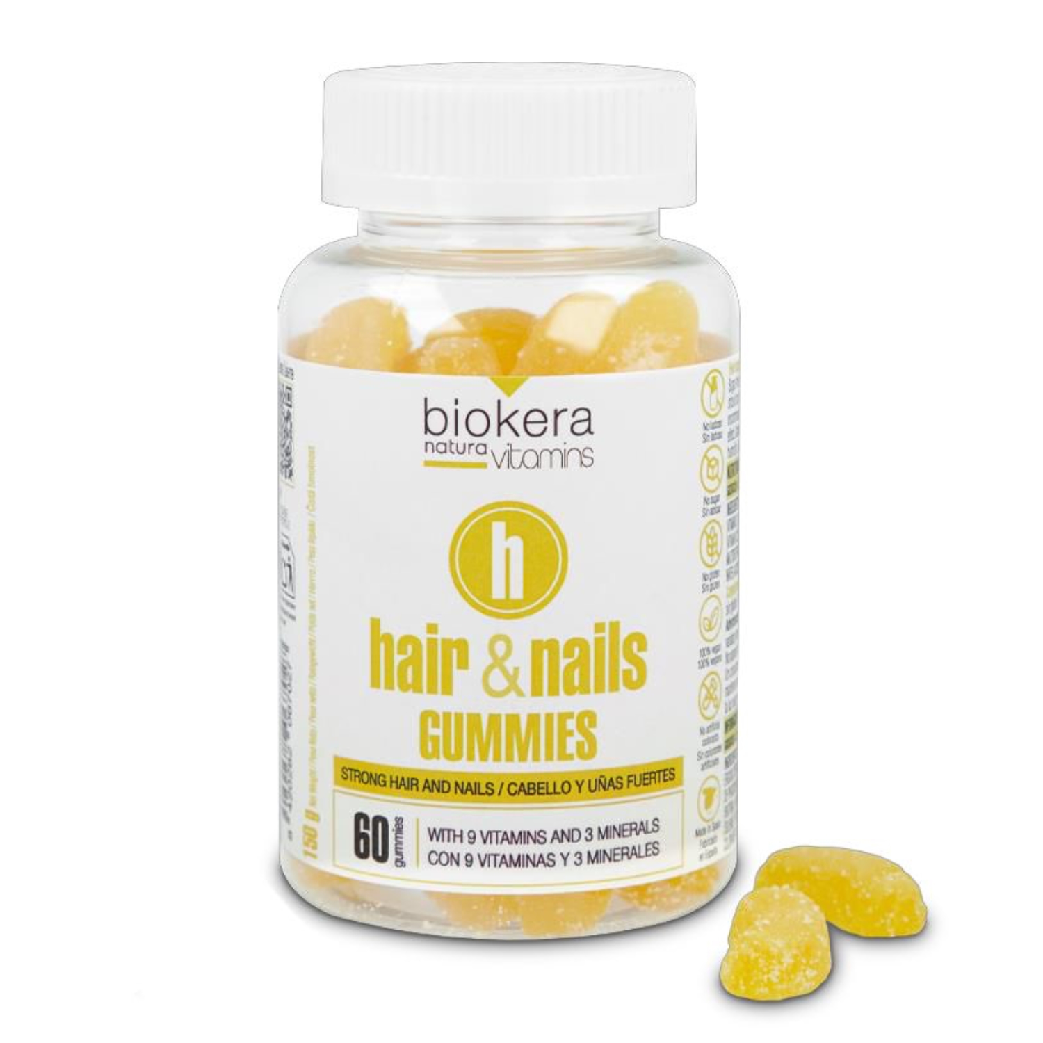 Salerm Biokera Natura Vitamins Hair&Nails Gummies (Strong Hair and Nails)gumové bonbóny s 9 vitamíny a 3 minerály pro silné vlasy a nehty. Doplněk stravy na bázi vitamínů a minerálů pro podporu zdraví vlasů a nehtů. Pomáhá bojovat proti ztrátě hustoty, stimuluje růstovéprocesy ve vlasech s nutričními problémy, které jsou umocněny stresem nebo nevyváženou stravou. Při pravidelném užívání gumových medvídků docílíte celkového zlepšení kvality vlasů, nehtů a pleti. Změny budou zřejmé na pohled i na dotek.Můžete očekávat zřetelné zpevnění nehtů a vlasů, urychlení růstu vlasů i nehtů, viditelné zvýšení pružnosti a pevnosti pokožky.