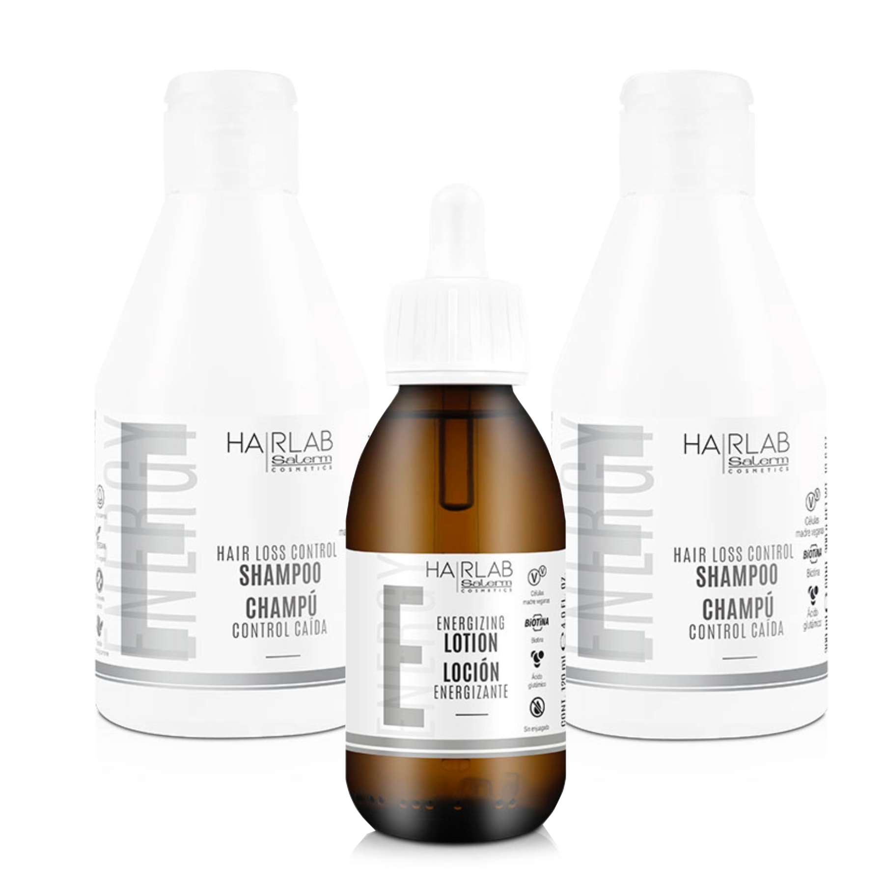 Salerm HAIR LAB Energy šampon proti padání vlasů (Hair Loss Control Shampoo/Champú Control Caida) je energizující šampon proti vypadávání vlasů pro slabé, křehké a řídnoucí vlasy. Silné vlasy začínají u zdravých kořínků. Díky rostlinnému komplexu, obsahující extrakty lopuchu, ženšenu, malabaru, sójový protein a kmenovou kulturu z bavlníku, šampon podporuje mikrocirkulaci a zpomaluje stárnutí vlasových folikulů. Šampon jemně čistí a zanechává vlasovou pokožku plnou energie a svěžího pocitu. Šampon stimuluje vlasové kořínky již při mytí. Při pravidelné aplikaci stimuluje buněčnou obnovu a regeneraci vlasů. Pravidelným používáním tohoto šampónu se snižuje riziko vypadávání vlasů.
