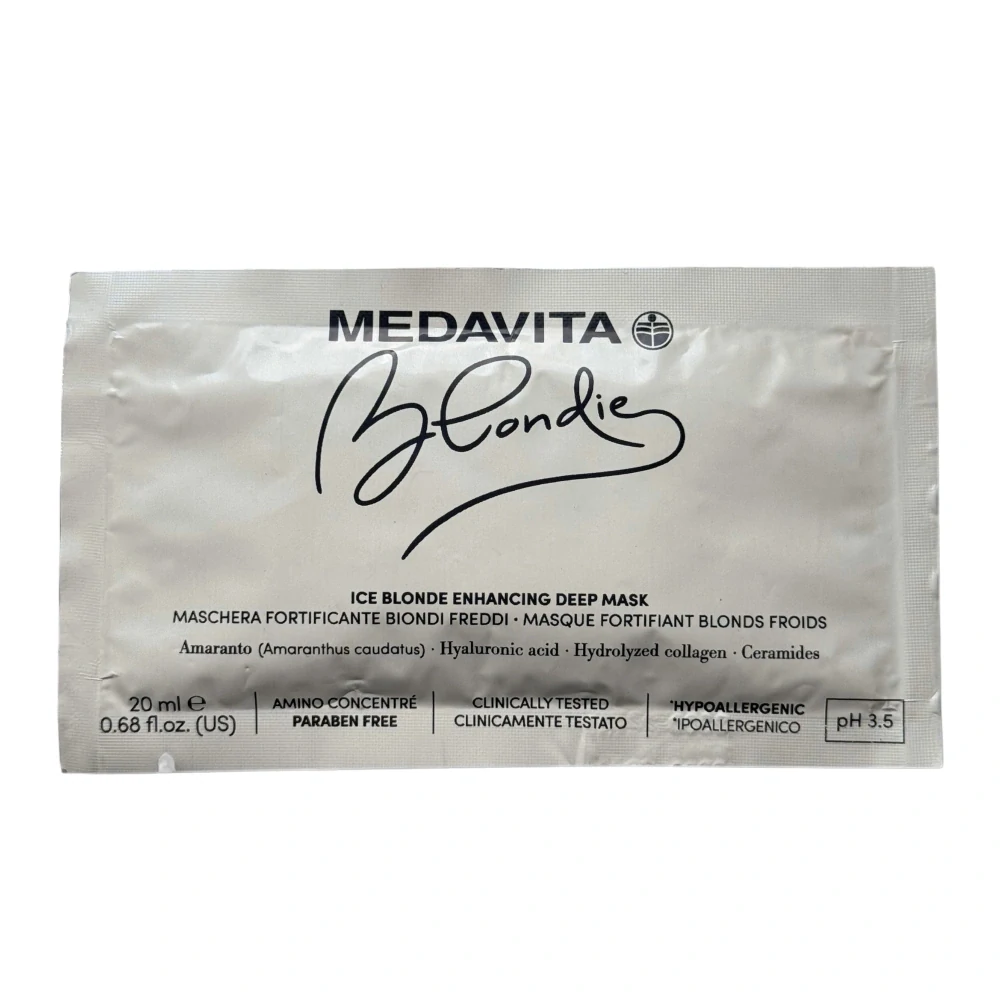 Medavita Blondie ICE Blondes Enhancing Deep Mask s pH 3,5 je zvýrazňující hloubková maska na vlasy určená speciálně pro studené odstíny blond vlasů. Maska s obsahem fialového pigmentu podtrhuje a zvýrazňuje popelavé, popelavě fialové a fialové odlesky. Maska proniká do vlasových vláken, chrání vlasy před oxidací a každodenním znečištěním a navrací vlasům jemnost a lesk. . Posilující bonding systém Medavita Blondie vyrovnává přirozené pH vlasů a stabilizuje vnitřní struktury cilitvých blond vlasů, které jsou náchylné na poškození. Pečlivě vybrané aktivní složky udržují blond vlasy silné a zdravě vypadající. Aktivní složky na bázi komplexu proteinů amaranta, kyseliny hyaluronové, tekutého kolagenu a ceramidů poskytují vlasům dlouhodobou hydrataci, zpevnění a ochranu. Maska na vlasy Medavita Blondie ICE je dermatologicky testována a je hypoalergenní.